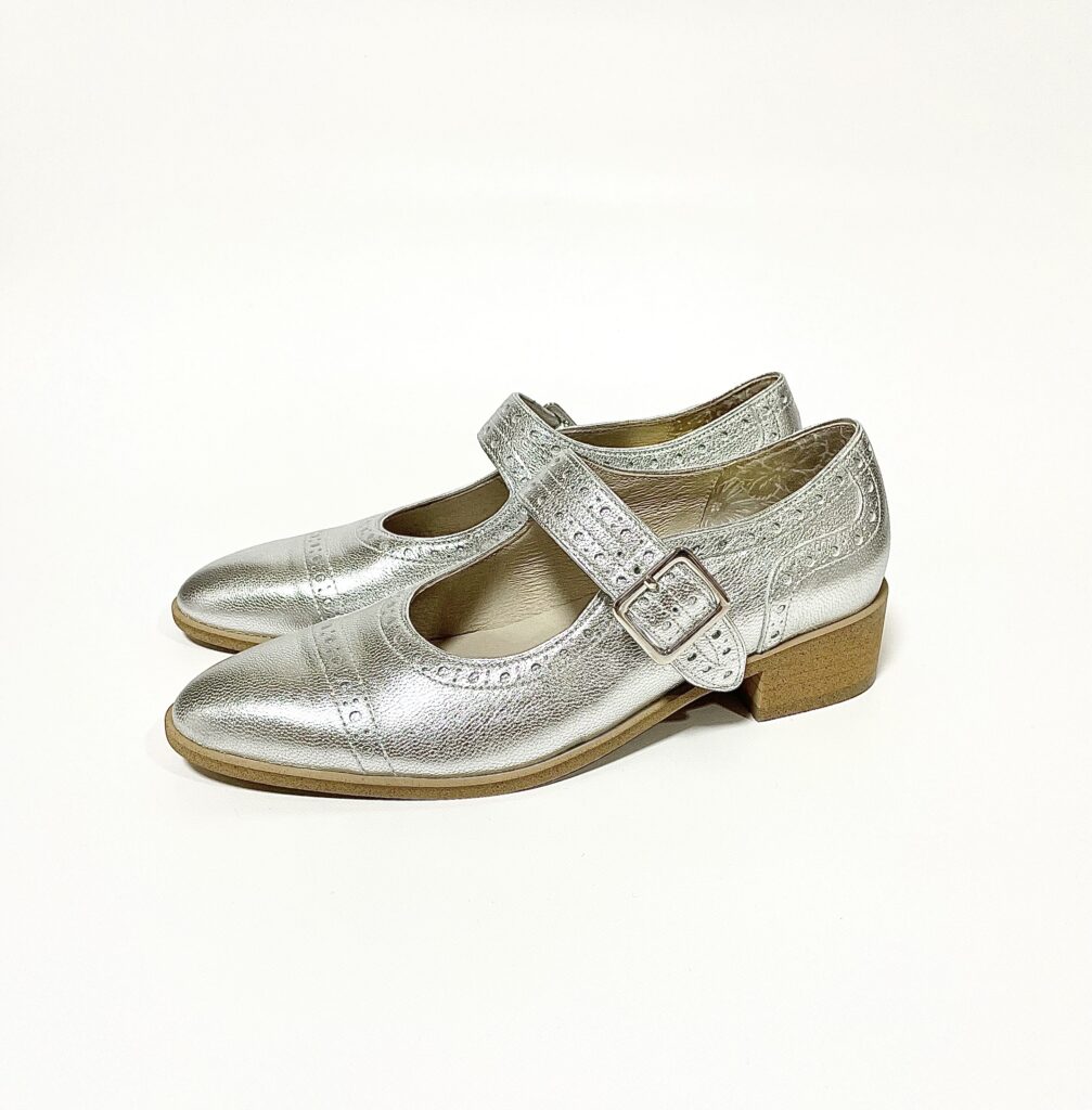 3月に、池袋の靴屋さん レディースキッド様 にて受注会をした際に作ったメリージェーンのシルバーです。ヤギの革で、キラキラのキメが大きめで輝きが華やかです。金具もシルバー。
